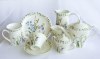 Elegantní čajovou soupravu s dekorem lučního kvítí. V sadě je 4x šapó (šálek + podšálek), 4x hrnek vyšší, 4x desertní talířek, konvice, džbánek, cukr + mléko. Celkem 20 kusů. Dovoz z Itálie. Pořizovací cena 10.400 Kč.