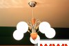 Stropní lustr pětiramenný. Chrom - dřevo. 5 skleněných koulí z mléčného skla. Jako nový, ale 1 koule je nepatrně poškozena - malá dírka. Cena 500 Kč.