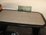 Konferenční stolek černý s šedými dlaždicemi, zkosené hrany. Rozměry 135x74x50 cm, dxšxv. Dále pak pojízdný servírovací stolek nahoře dlaždice a dole čiré sklo. Rozměry 74x51x55.Délka i madlem a výška i s kolečky. Konferenční za 499 Kč a servírovací 799 Kč.