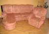 Zánovní sedací souprava (stáří 3 roky, málo používaná), gauč trojsed s rozkladem na lůžko a úložným prostorem + křeslo. Rozměry (š x v x h) v cm: Gauč - 256 x 104 x 88/156, křeslo 102 x 104 x 88, v obou případech výška sedu 42 cm. Rozměr lůžka 198 x 120, vhodné pro běžné spaní, nejen příležitostné. Součástí je 5,5 m originál potahové látky, šířky 150 cm, pro případné opravy, resp. potažení doplňků (taburet a pod.).