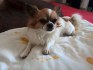 Čivava. Skoro 3letý pes dlouhosrsté čivavy, hnědobílý strakouš s PP.