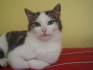 Evropská kočka domácí. Tomášek se zpočátku hodně bál a při pokusu o kontakt syčel a krčil se, nyní je už z něho milý a hodný kocourek. určitá míra plachosti v něm stále je a cizích lidí se trochu bojí, k nám už ale je milý a hodný.Je čistotný, vhodný tedy do bytu i do domečku se zahrádkou.